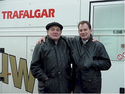 | Peter and Rudy with the bus Photo by Sallie Taylor |